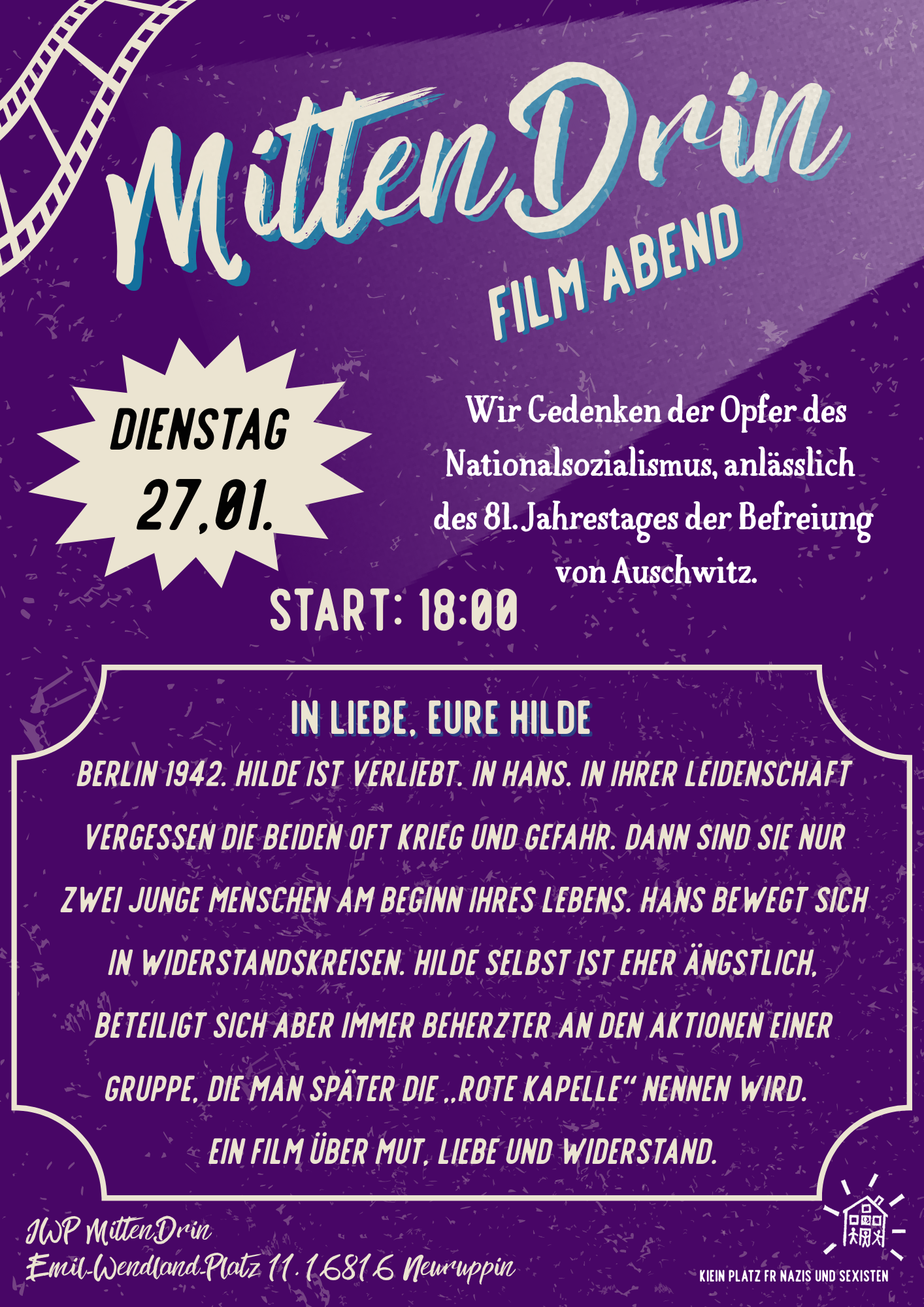 Anlässlich des 81. Jahrestages der Befreiung von Auschwitz und im Gedenken an die Opfer des Nationalsozialismus, möchten wir mit euch den Film „In Liebe, eure Hilde“ schauen.